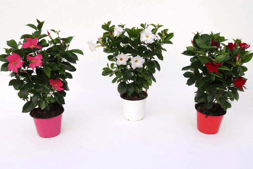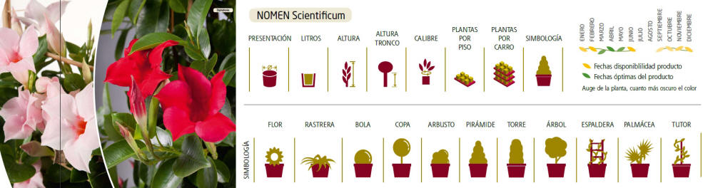 También conocida como Jazmín de Chile o Mandevilla, es una especie trepadora resistente, de hojas coriáceas verde brillante y llamativas flores atrompetadas de fragante aroma.